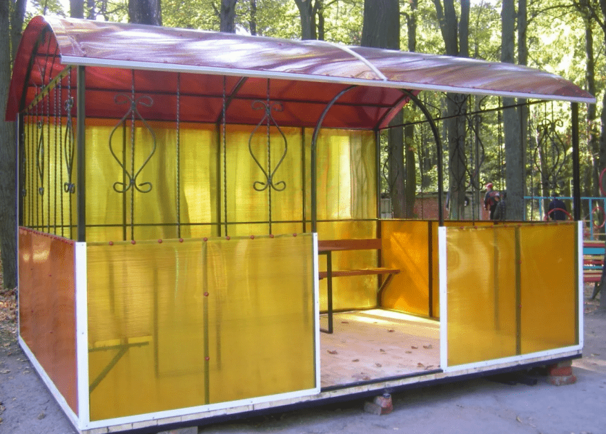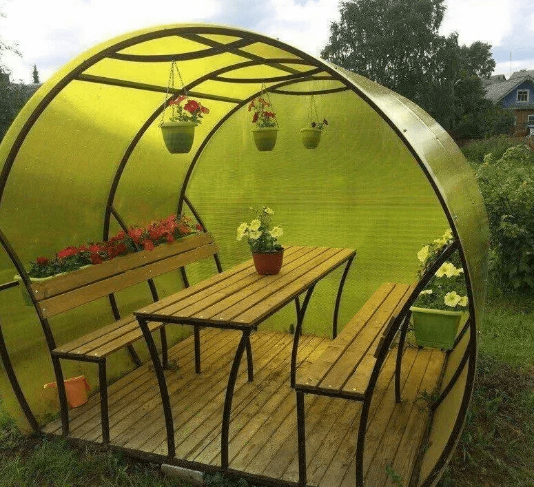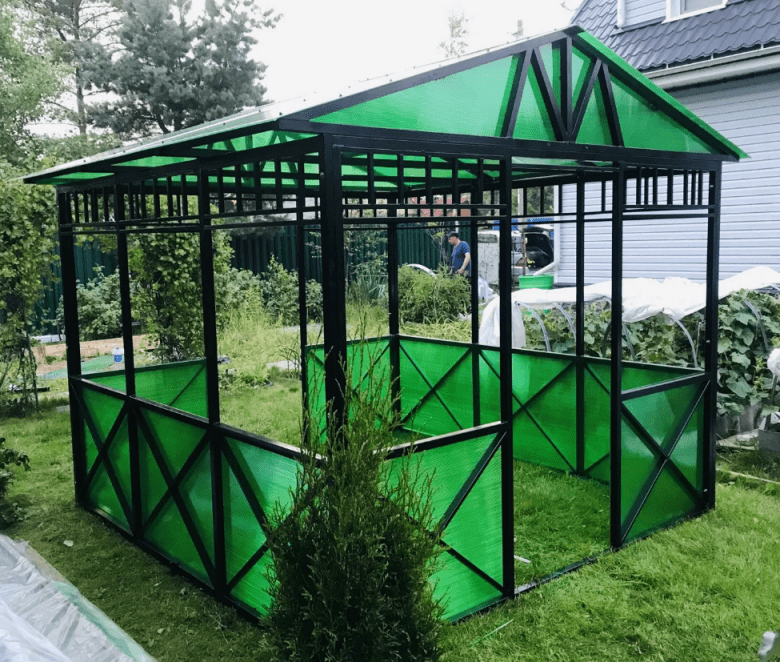 - Если беседка закрытого типа и в ней предусмотрены окна, то они изготавливаются из поликарбоната или мягкого стекла. В других случаях стенки беседки перекрываются металлическим профилем.