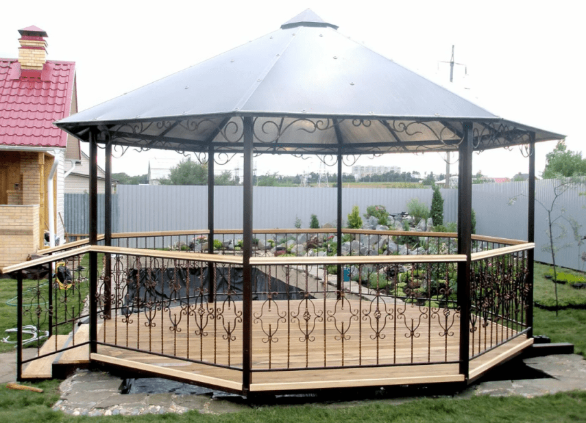 Беседка шестигранная для дачи 4х4х3,5 м с коваными ограждениями и крышей из металлического листа