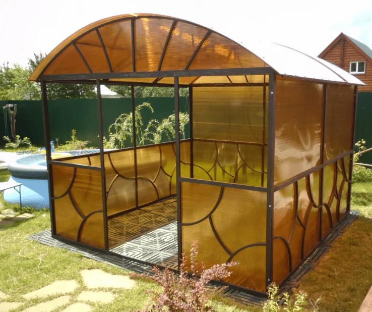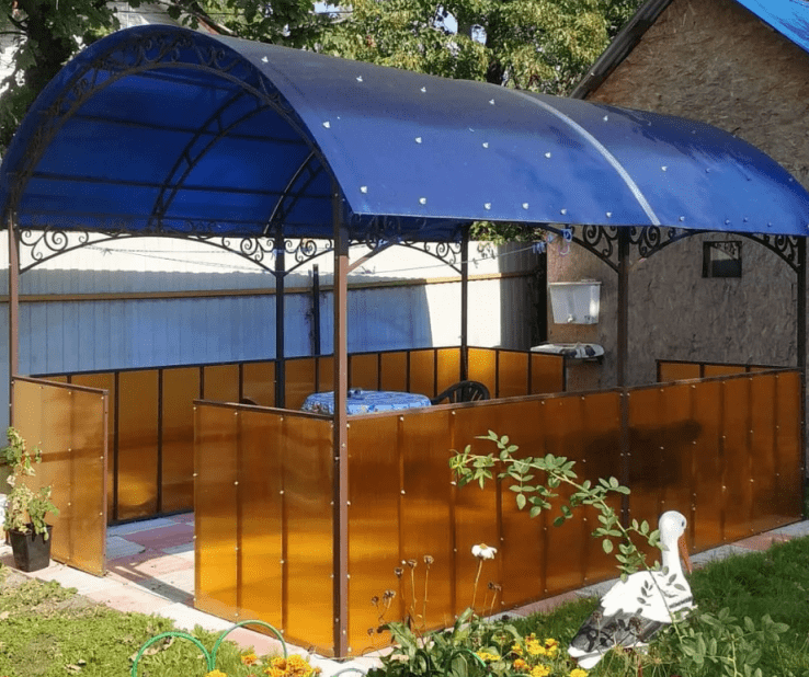 Беседка 2,5х3х2,4 м с ограждениями из профильной трубы и крыша из поликарбоната арочной формы