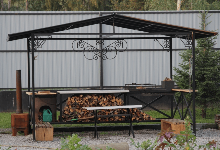Мангал-беседка с широкой крышей, столиками и декоративными узорами