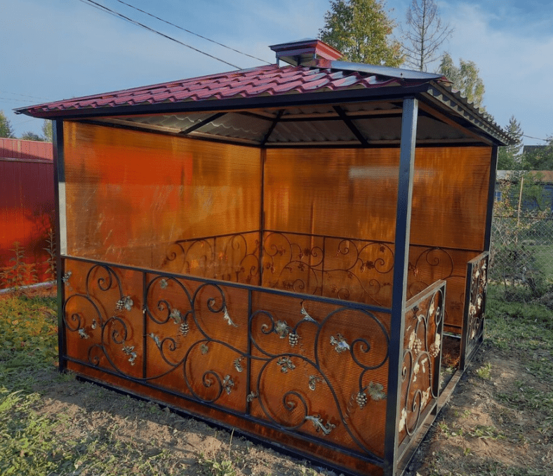 Садовая беседка 3х3х3 м с коваными ограждениями, закрытая поликарбонатом с 2-х сторон, кровля из металлочерепицы