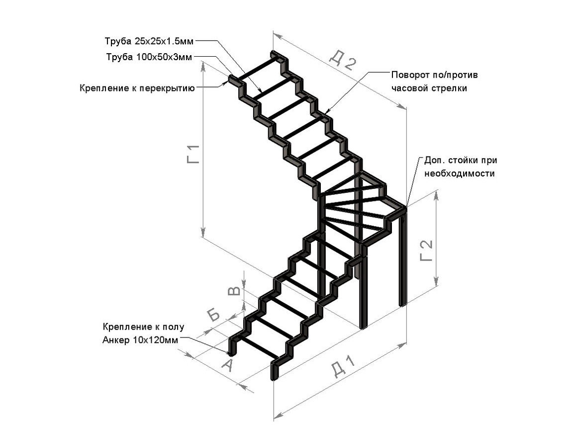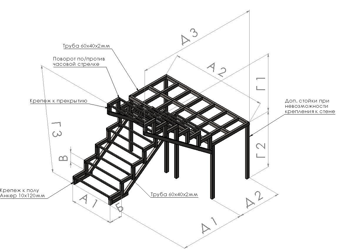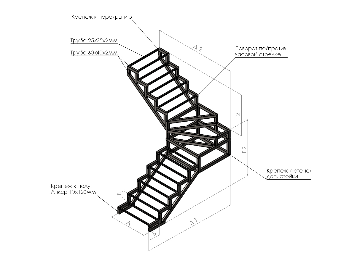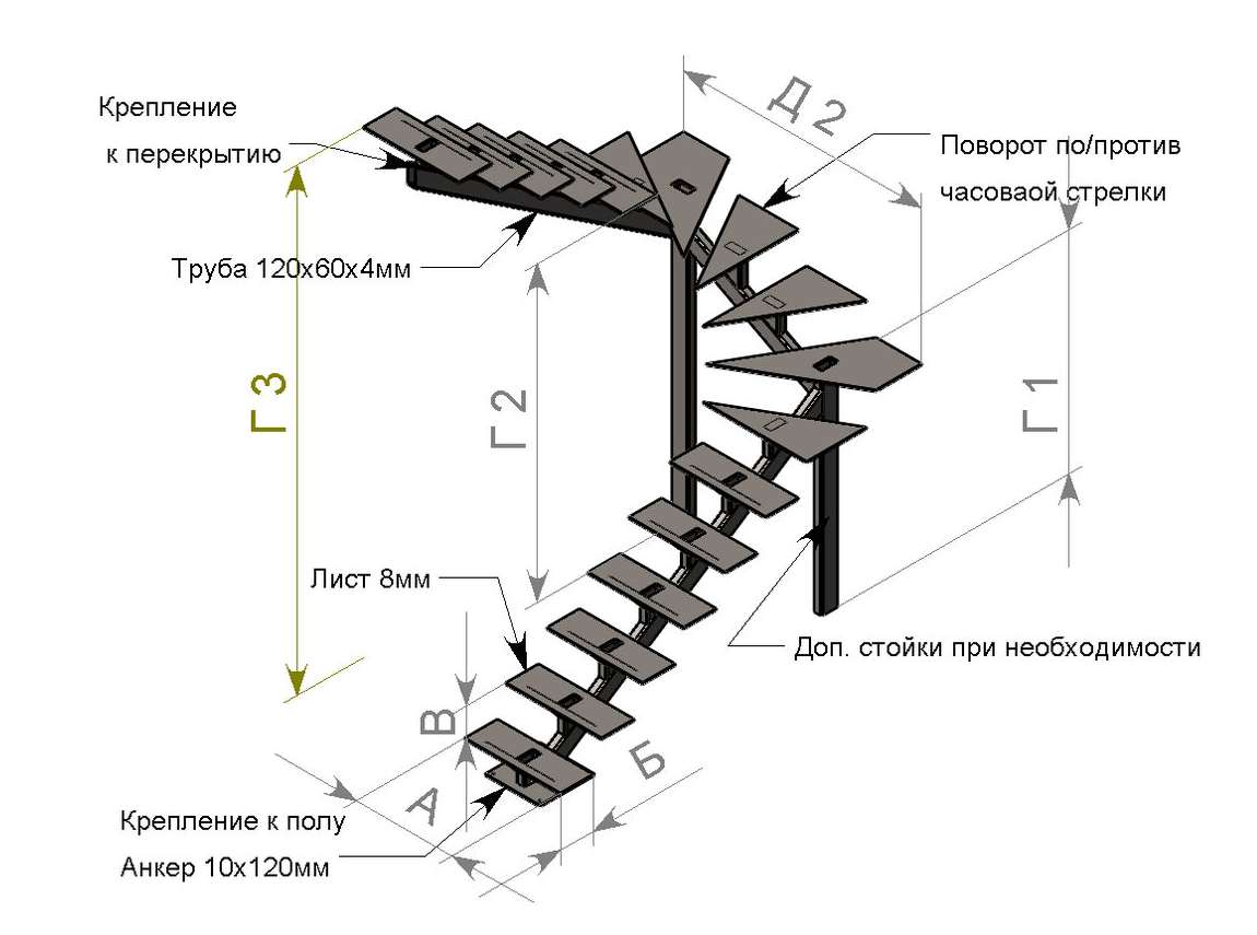 - Определяем тип конструкции, количество ступеней и размер шага.