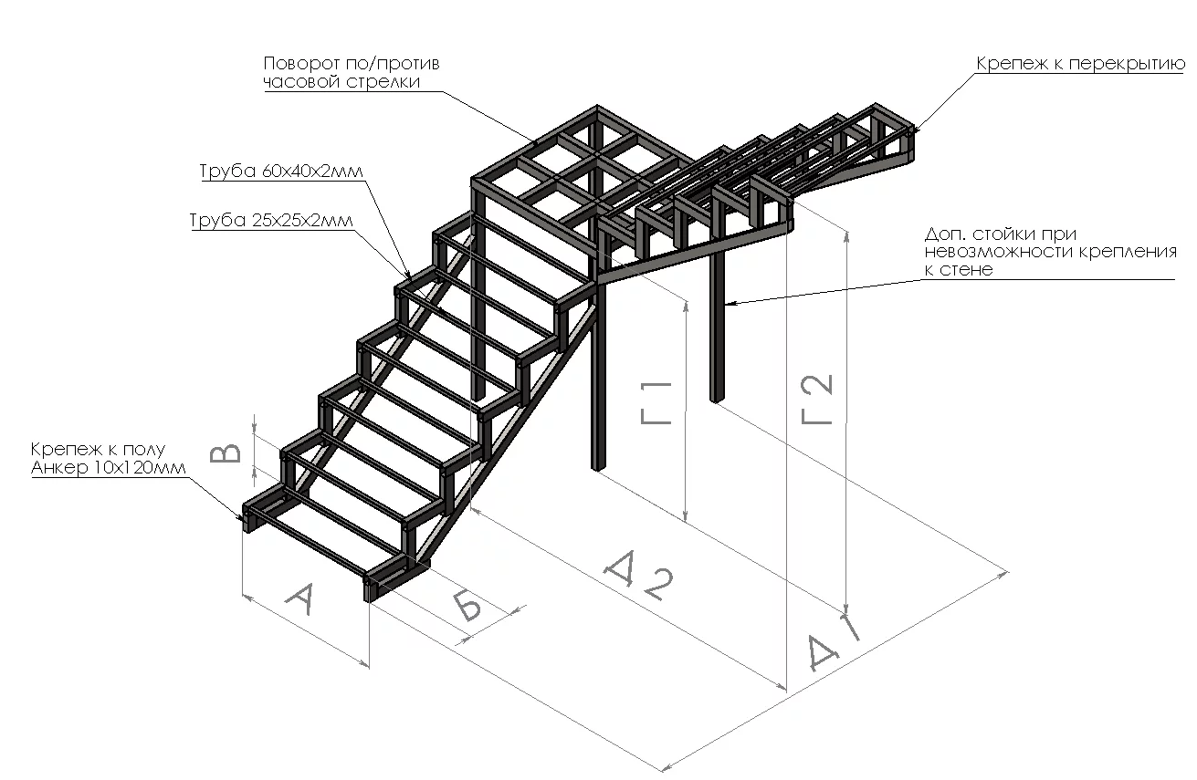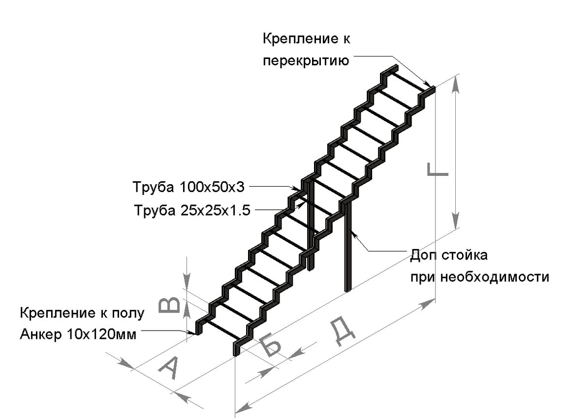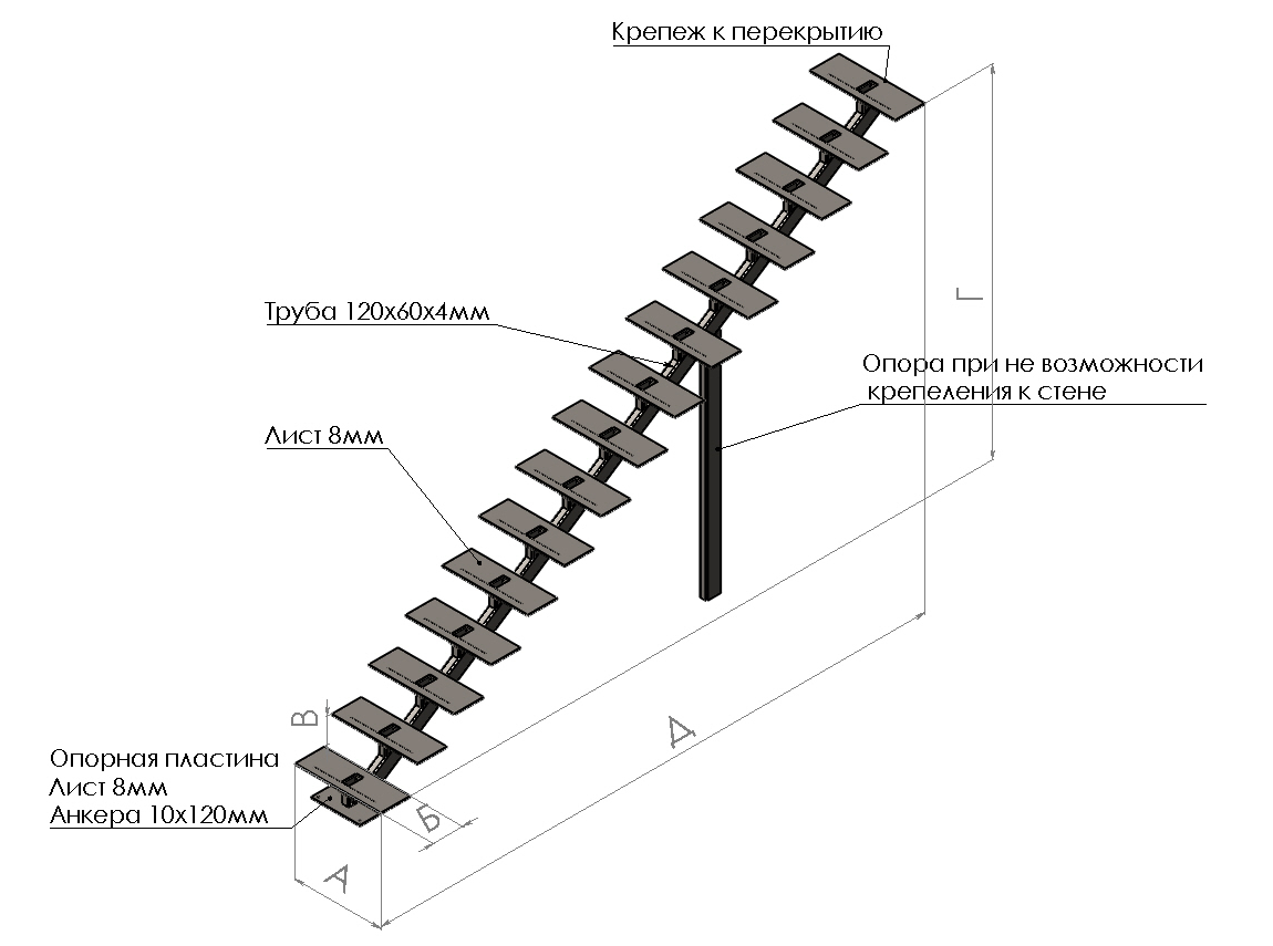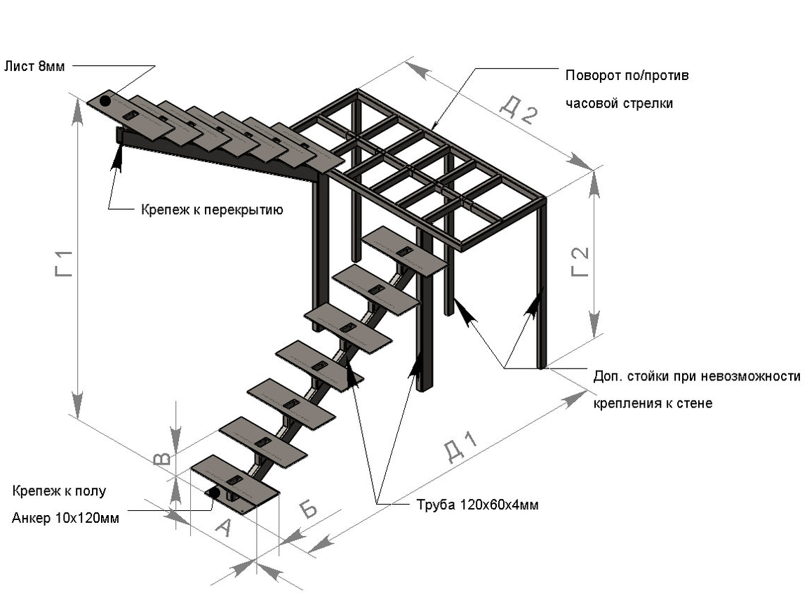 - Определяем тип конструкции, количество ступеней и размер шага.