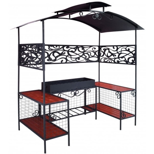 Мангал-беседка с широкой крышей, столиками и декоративными узорами