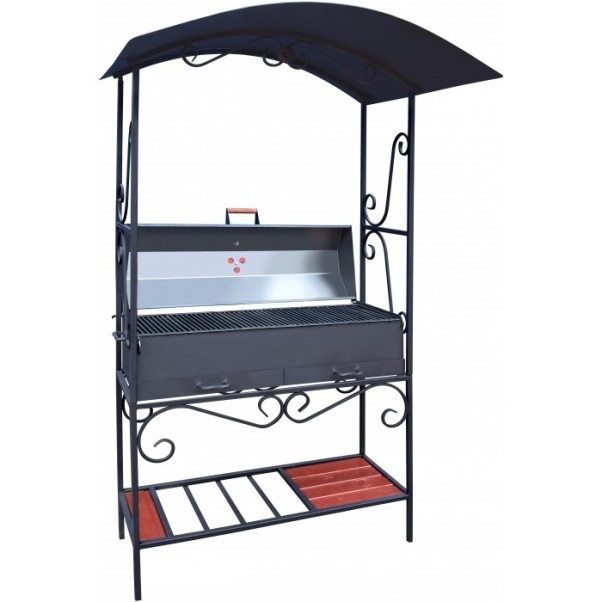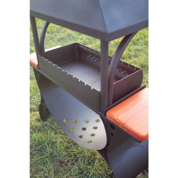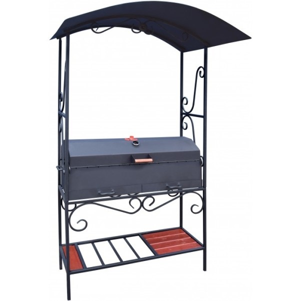 Мангал с крышей на колёсах, подставкой для казана и декоративным узором