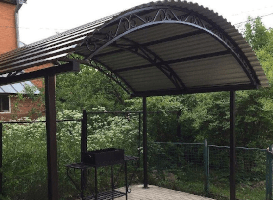 - Кованые элементы сочетаются с любым видом материала для навеса, при этом эстетично дополняют внешний вид навеса.
