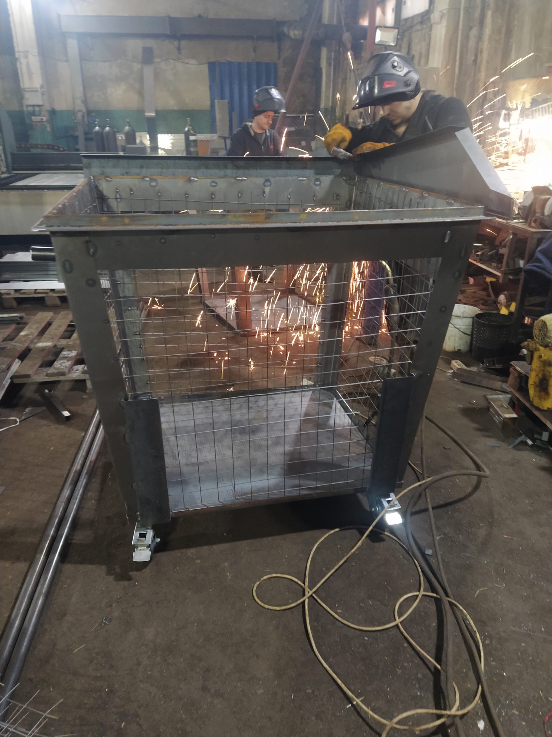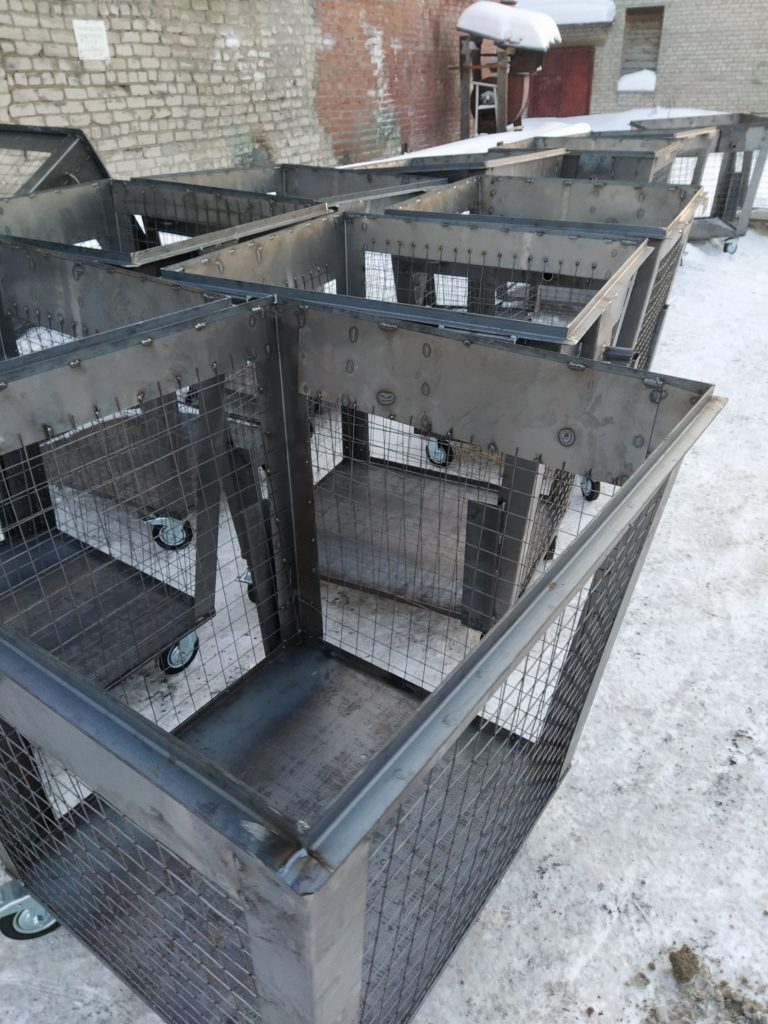Изготовили 100 сетчатых контейнеров для раздельного сбора мусора, объемом 1.1 куб.м. Для изготовления использовалась лазерная резка, ЧПУ гибка листового металла, резка на отрезных машинах, сварка электродуговая и полуавтоматическая, покраска алкидная.
