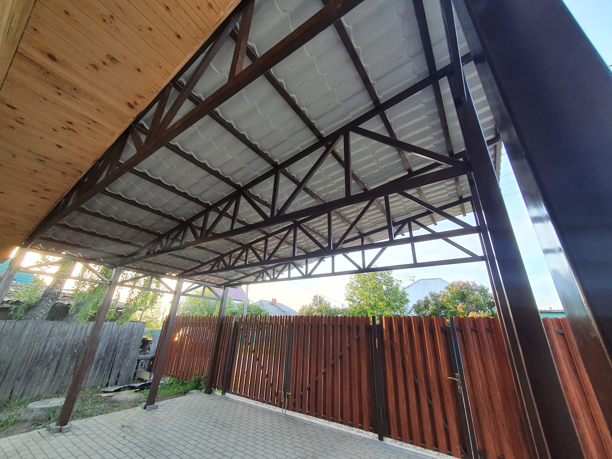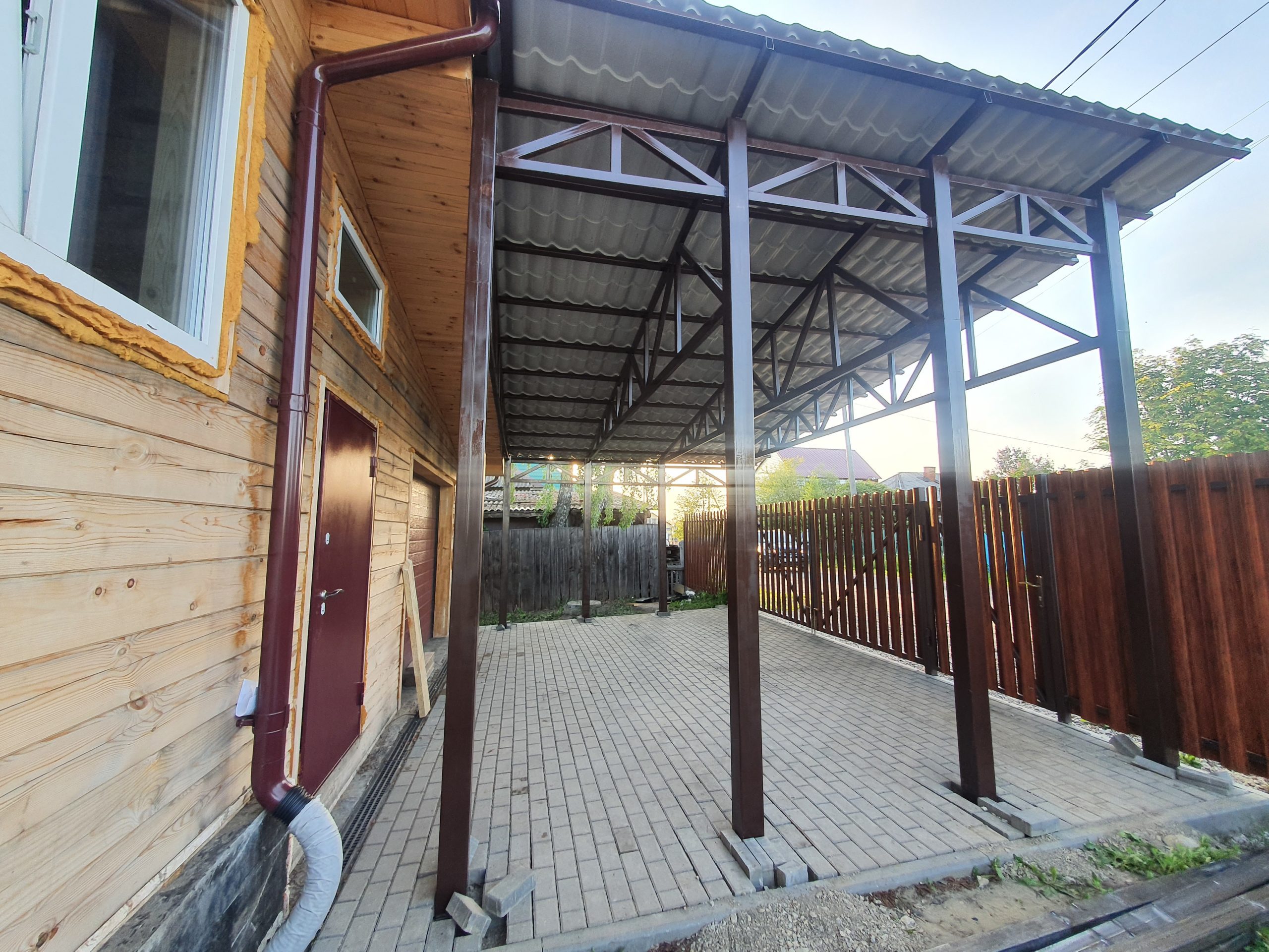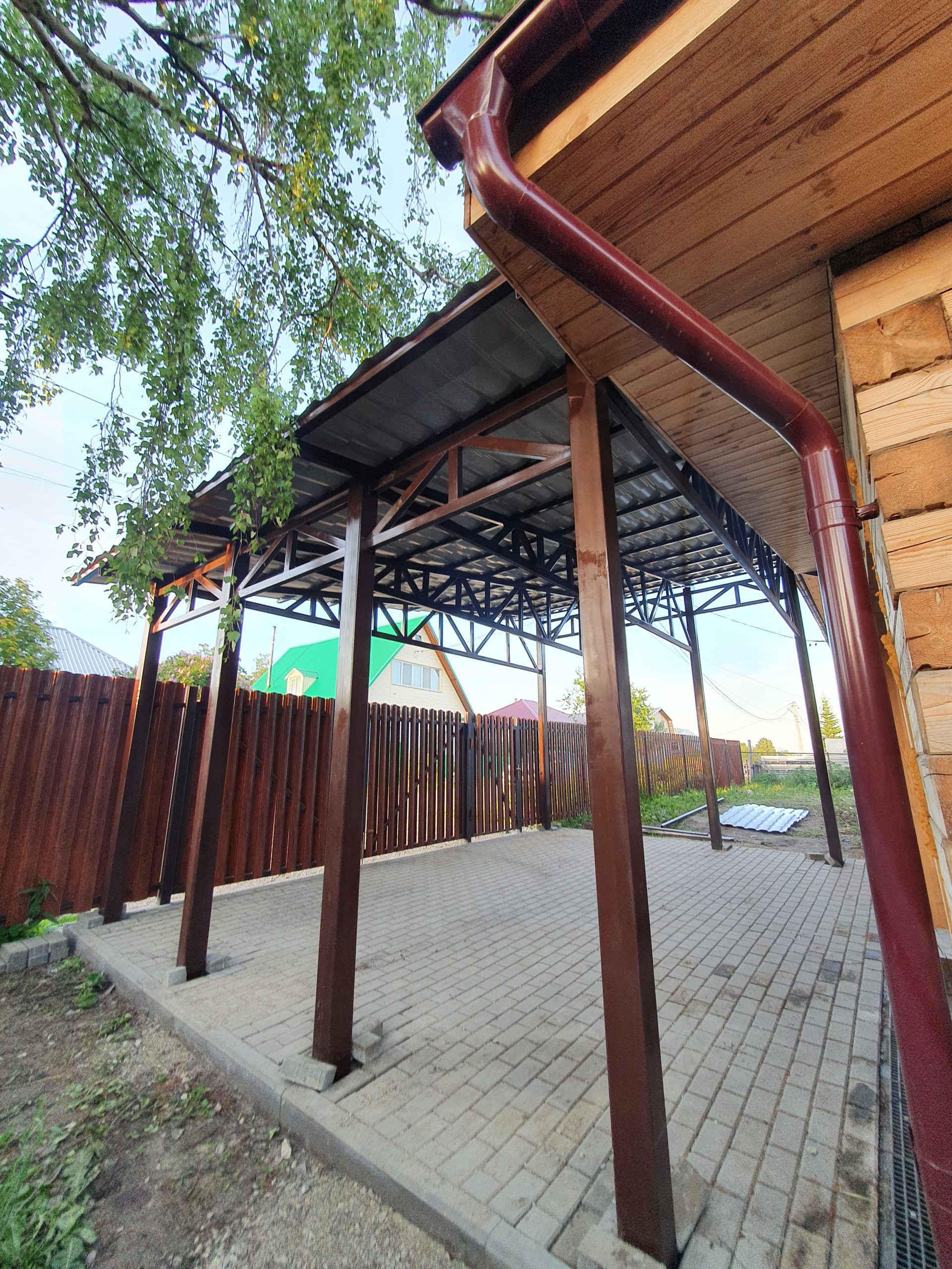 Изготовлен металлический теневой навес под автомобиль на окраине города.