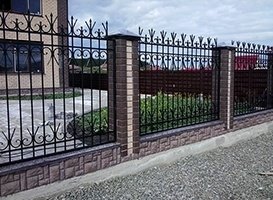 - Вы можете комбинировать материалы. К профильной трубе подходит профнастил, элементы холодной и горячей ковки, поликарбонат, хорошо смотрится в сочетании с кирпичными столбами, но легко монтируется и на простые врытые в землю металлические трубы.