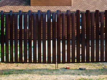 - Имитация забора из натурального дерева, без минусов последнего. Хорошо сочетается с кирпичными столбами.