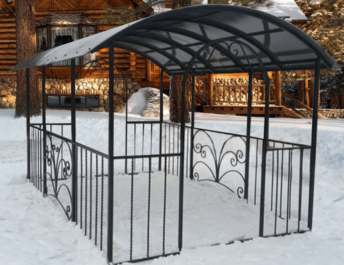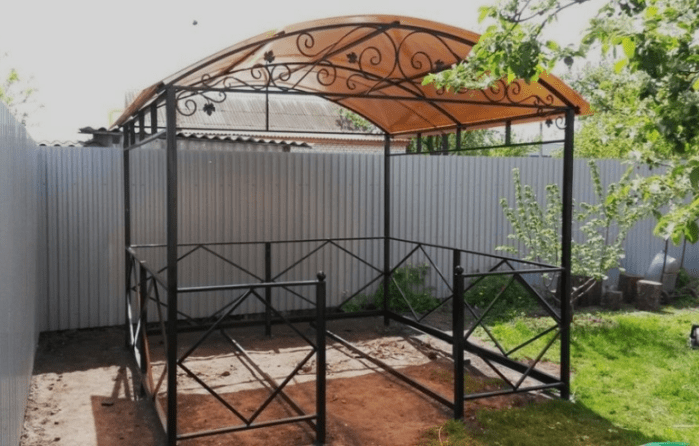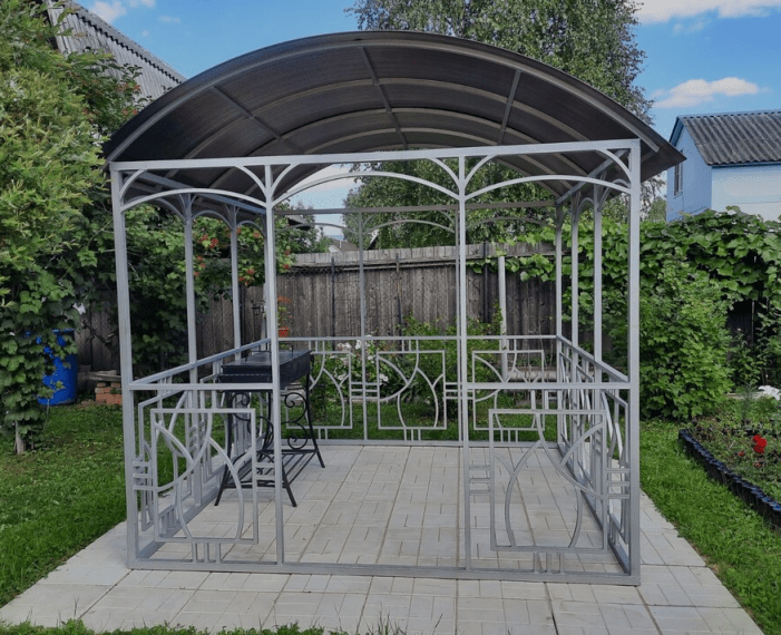 Беседка 2,5х3х2,4 м с ограждениями из профильной трубы и крыша из поликарбоната арочной формы