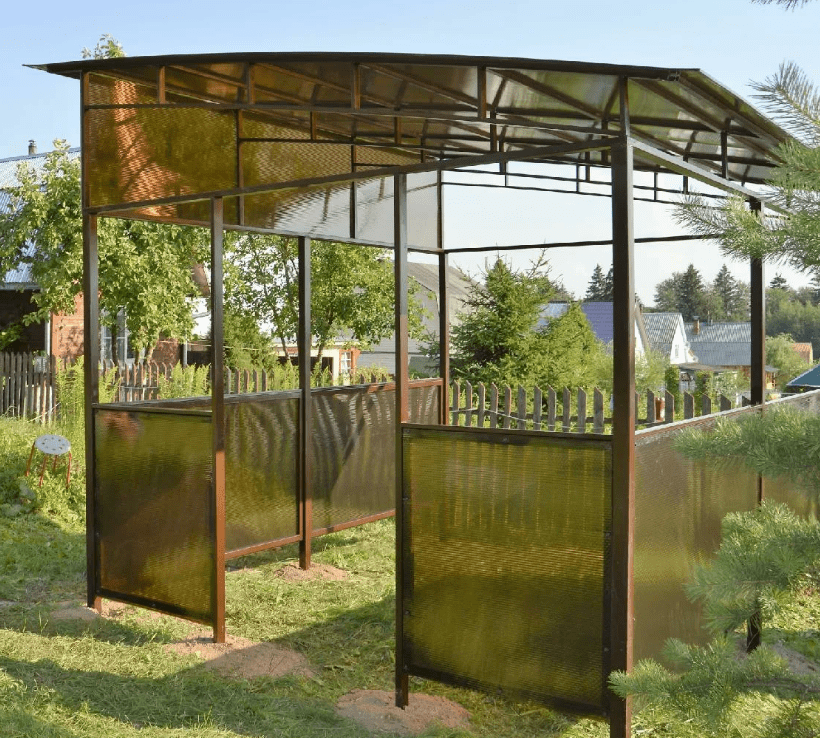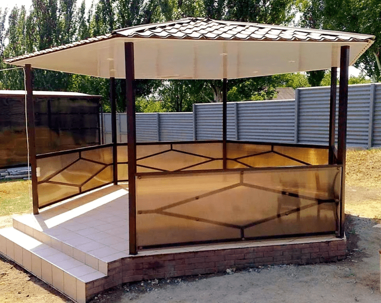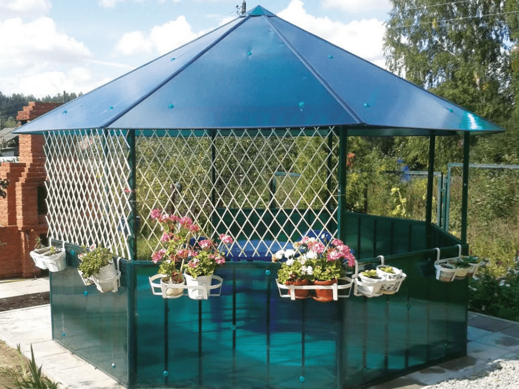 - Если беседка закрытого типа и в ней предусмотрены окна, то они изготавливаются из поликарбоната или мягкого стекла. В других случаях стенки беседки перекрываются металлическим профилем.