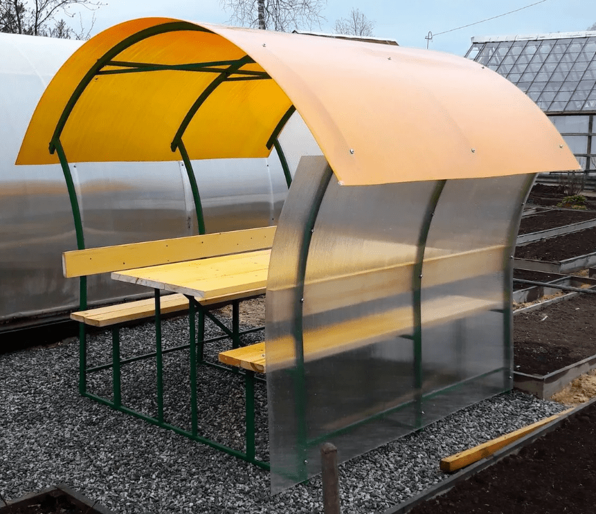 Закрытая беседка для дачи из поликарбоната 3х2,5х2,5 м со столиком и скамейками