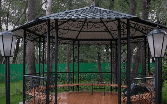 Беседка шестигранная для дачи 4х4х3,5 м с коваными ограждениями и крышей из металлического листа