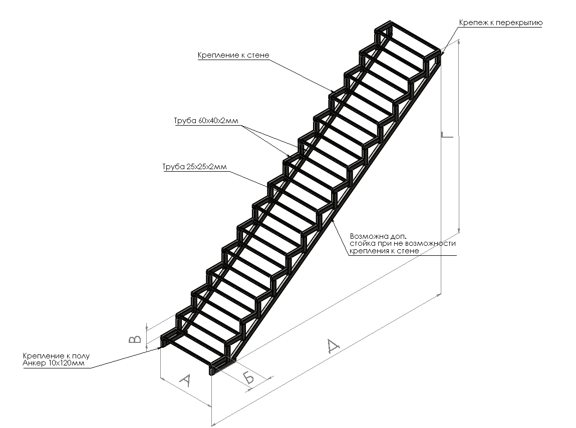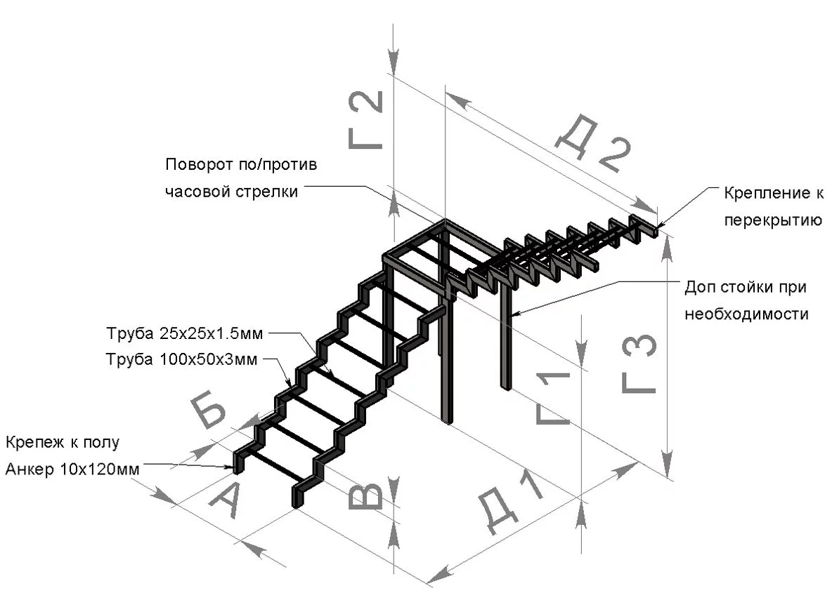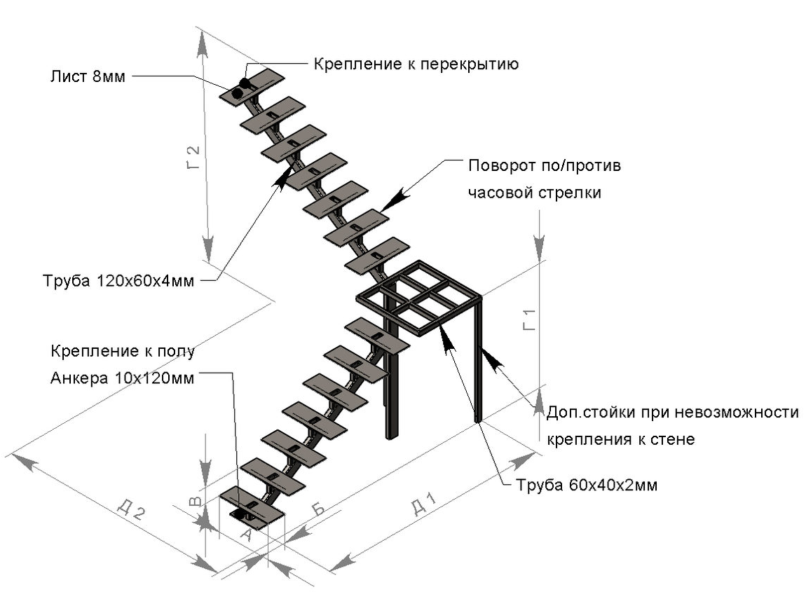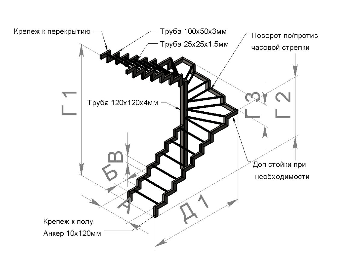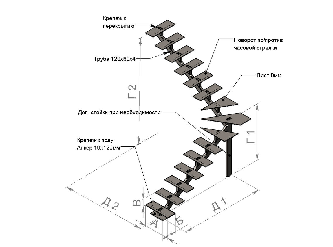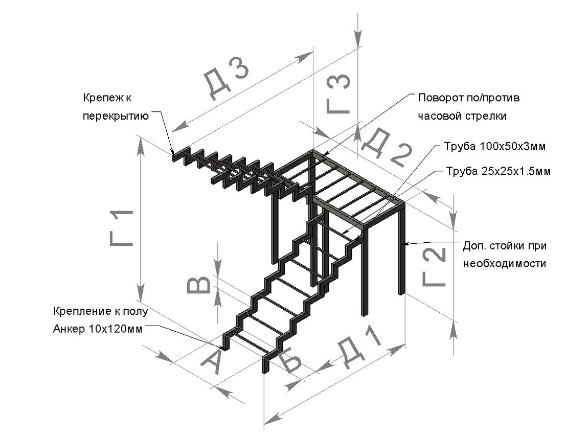 - Определяем тип конструкции, количество ступеней и размер шага.