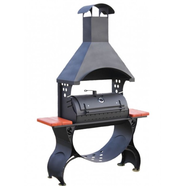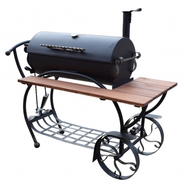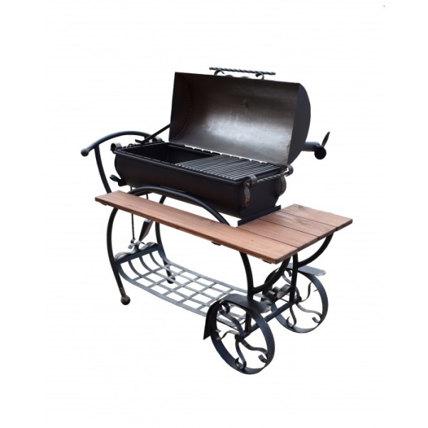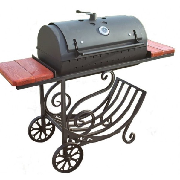 Кованный мангал барбекю гриль комплекс на колёсах с цилиндрической жаровней