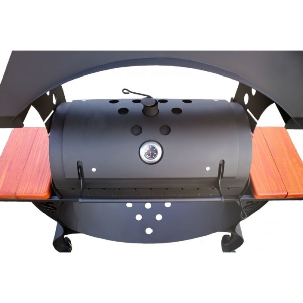 Мангал с крышей на колёсах, подставкой для казана и декоративным узором