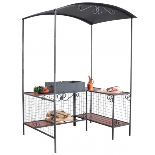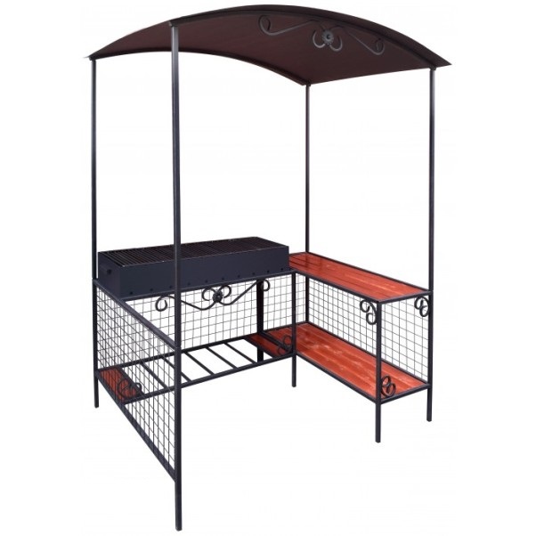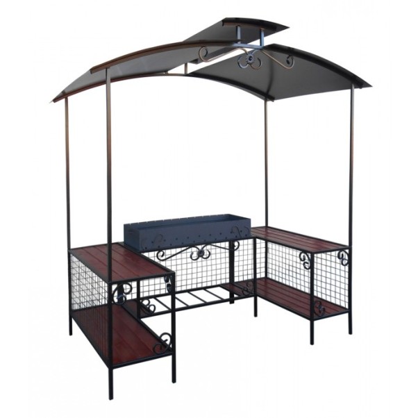 Мангал-беседка с широкой крышей, столиками и декоративными узорами