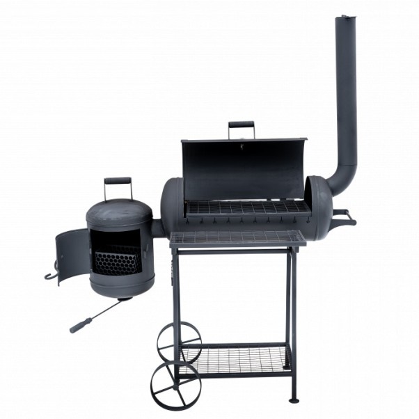 Цельносварной мангал с высоким дымоходом и боковыми столиками