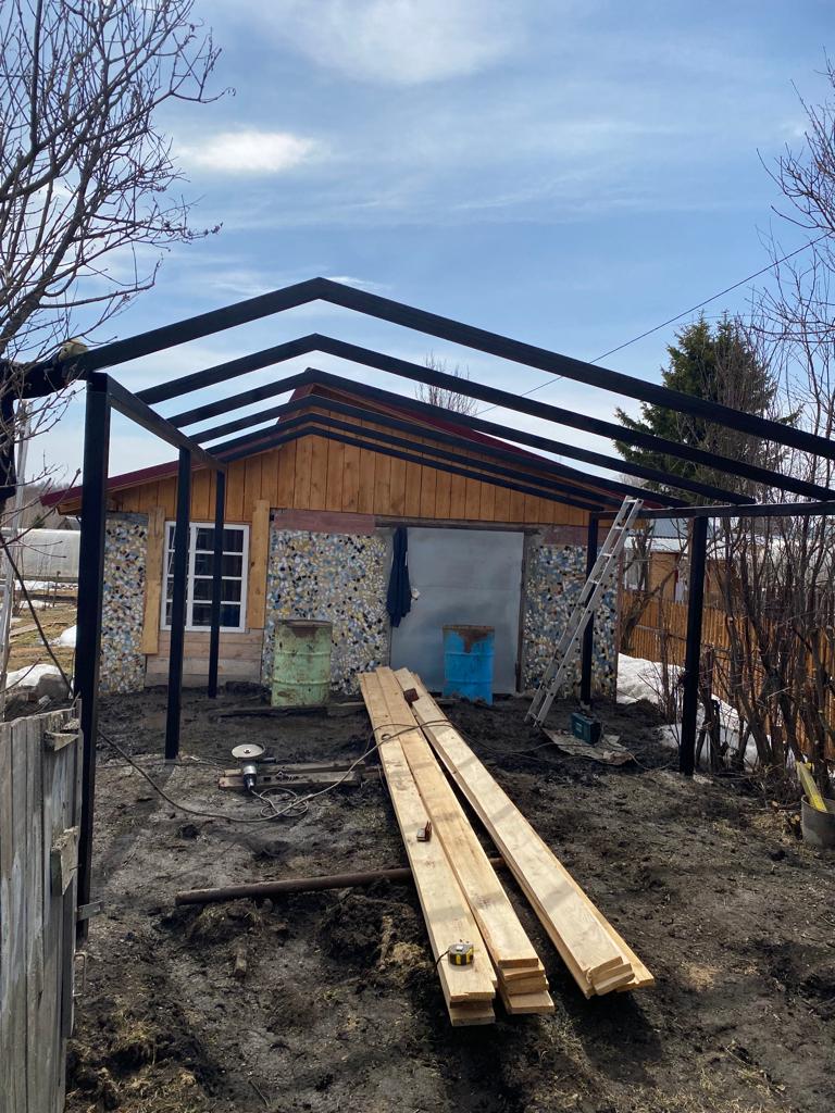 Изготовили и смонтировали навес к дому. В качестве фундамента по желанию заказчика использовали бетонные столбы, получилось 6 точек опоры. Каркас навеса изготовлен из профильной труб крупного сечения, что придаёт ему повышенную прочность и жёсткость. У нас Вы можете заказать практический любой навес, предназначенный для дома, дачи, автомобиля или парковки. Ознакомиться с нашим предложением можно по ссылке: https://ironbash.ru/navesy/.