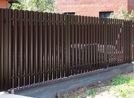 - Имитация забора из натурального дерева, без минусов последнего. Хорошо сочетается с кирпичными столбами.